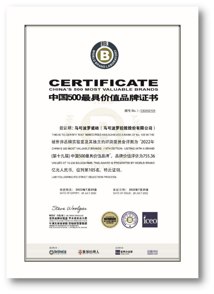 马可波罗深耕建陶行业数十载,立志为中国陶瓷打造出第一个世界知名品牌,多年来一直深入推进智能制造和绿色生产,坚持科技创新和文化创新双轮驱动,汇聚磅礴的品牌力量。2022年,世界品牌实验室评定“马可波罗瓷砖”品牌价值高达755.36亿,这既是行业对其品牌实力的高度认可,更是为品牌的高质量发展注入强劲动力。