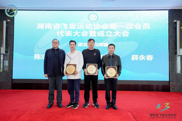 湖南省体育局二级巡视员、省体育总会专职副主席兼秘书长王晃先生为省飞盘运动协会第一届委员会副主席程震、万成林、姜景平、谢一鸣、蒋伟颁发牌匾