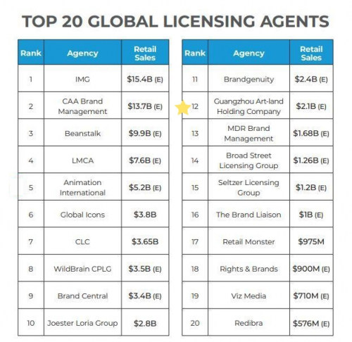 艺洲人入榜“全球授权代理商TOP20榜单”,蝉联榜单第12名
