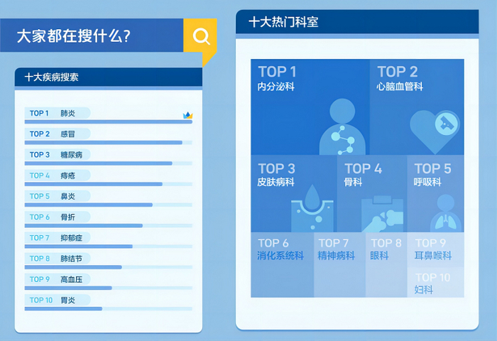 除了医生等专业人士提供的权威内容,报告还呈现了用户对疾病原理、防治的关注。报告显示,肺炎、感冒、糖尿病、痔疮、鼻炎是抖音用户搜索次数最多的疾病;内分泌科、心脑血管科及皮肤病科是用户最常关注的科室。