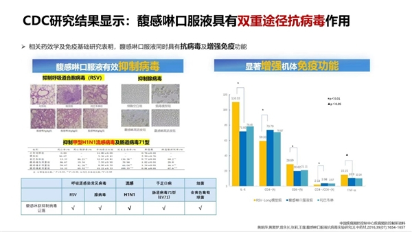 中国疾病预防控制中心病毒病预防控制所技术支持开展的基础研究显示:馥感啉口服液具有直接抑制病毒和调节免疫双重途径抗病毒作用,既可抑制甲型流感病毒(甲型H1N1)和呼吸道合胞病毒(RSV),对肺组织有显著保护作用,又可激活免疫系统,通过调节T细胞亚群释放多种细胞因子抑制炎症反应。高质量循证研究证实,馥感啉口服液可缩短感冒病程,降低传变风险,减少反复次数,对免疫功能低下及有基础疾病儿童呼吸道感染获益更多。