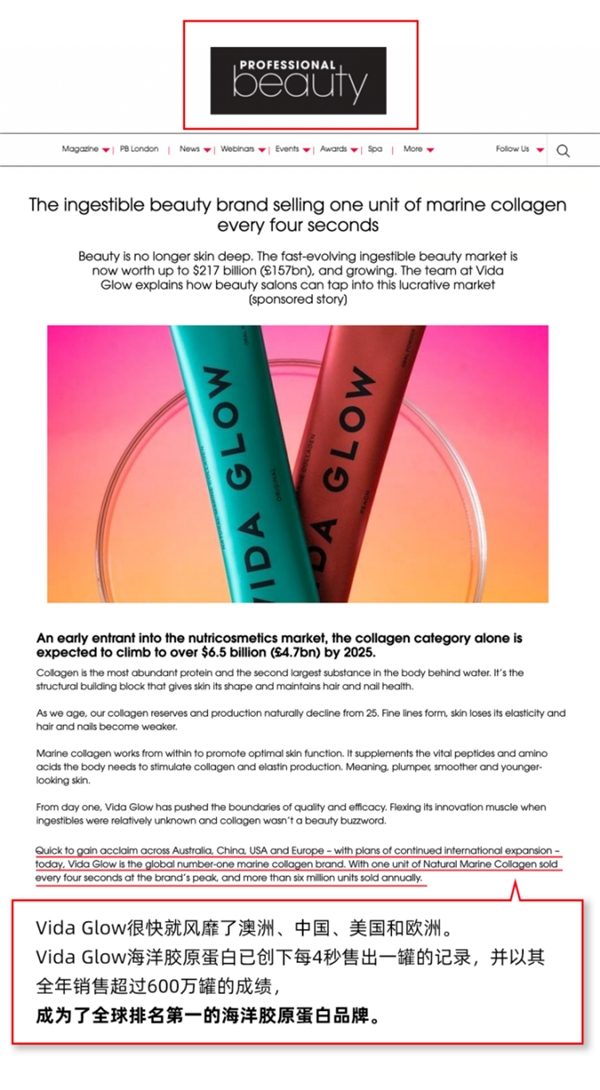 2021年,英国美妆业顶级垂直媒体《Professional Beauty》评价Vida Glow海洋胶原蛋白肽“凭借创新能力对传统行业标准发起了挑战,以出众的品质和功效超越了消费者的预期”,正式认证成为“全球排名第一海洋胶原蛋白”。