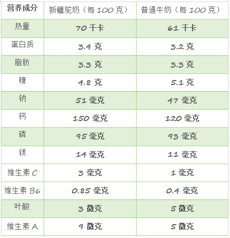 骆驼奶的营养成分绝不亚于牛奶。骆驼奶中乳铁蛋白和溶菌酶,含量比牛奶高5-10倍,这两种有杀菌作用的物质可强化人体的免疫系统。骆驼奶富含的维c是牛奶的三倍,铁含量是牛奶8倍,每100克驼奶含903毫克钙,含钙量很高。骆驼奶高钙,饱和脂肪酸低,甚至还具有医疗价值。此外,骆驼奶的蛋白质含量与钙含量均高于牛奶,脂肪含量则低于牛奶。