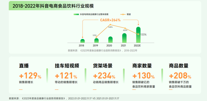 抖音电商食品饮料行业也快速增长,2022年同比增长133%,2018-2022年的复合增长率更高达264%,远超整体线上市场大盘增速。直播、挂车短视频、货架场景均增长良好,实现以内容驱动生意增长,高效转化消费兴趣。