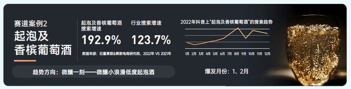 起泡及香槟葡萄酒赛道:2022年搜索同比增长192.9%,搜索趋势升温明显;男性主力,24-30岁人群热度最强,城市分布集中在一线城市、新一线城市和二线城市。起泡及香槟葡萄酒赛道的趋势概念表现场景的社会性,即浪漫约会与亲友团聚,以及仪式感的生活气氛和上档次的品质要求。