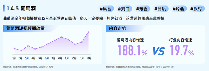 白酒相关的视频内容创作受节点营销影响较大,在春节、618、双11有明显提升,全年视频播放播放持续增长;热点上萌娃开启饮酒教育,新国标实施备受关注。啤酒相关视频内容的创作和播放集中在气温炎热的5、6、7月;足球的标配是啤酒,手拎啤酒海边踏浪,邀请你#在啤酒里看海。葡萄酒全年视频播放在12月圣诞季达到峰值;冬天一定要喝一杯热红酒,论营造氛围感当属香槟。洋酒全年视频创作在5、6月有明显增长;围绕饮酒氛围、情绪类相关内容热点与板块匹配度高。