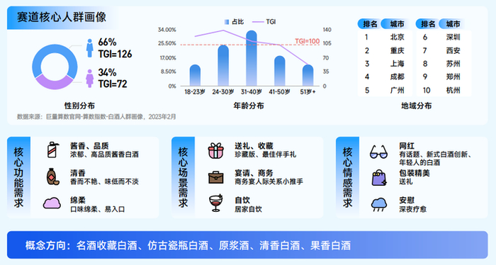 白酒赛道:2022年搜索同比增长124.4%,搜索趋势升温明显;男性兴趣远高于女性,31-40岁人群占比最高,城市分布集中在一线城市和二线城市。白酒赛道的趋势体现在基于场景下的产品创新:浓香酱香型的白酒仍需更高端的产地标识、社会认知;清香型口味创新、故事创新将年轻人引入白酒的赛道。