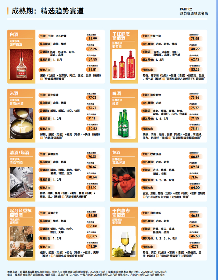 巨量算数&算数电商研究院综合趋势赛道评估模型,筛选出了14个酒水行业趋势赛道,覆盖白酒、啤酒、洋酒、葡萄酒等多板块,我们认为推动品类的创新力集中在功能创新、场景创新和情感创新。“酱香”“色泽好”“正式”“品质”是白酒赛道的核心爆品因素;“清爽”“精酿”“顺滑”“新鲜”“味道好”是啤酒的核心爆品因素。