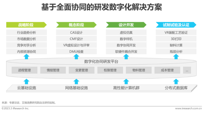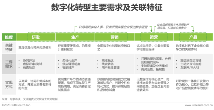 据艾瑞数智研究,汽车行业价值体系重塑,将全面推进汽车行业的数字化转型,主要体现在:①研发端:全流程协同研发助力企业缩短决策链,实现研发流程变革。②生产端:全链路智能制造方案成效显著,部分核心问题仍有待解决。③营销端:全场景营销助力挖掘用户生命周期中的长期价值。④运营端:以数据作为核心资产,以服务客户为关键驱动的端到端企业级数字化决策平台。⑤架构端:功能域集成势头正盛,中央计算单元将满足未来智能化趋势。⑥通信端:在5G-A通感一体化趋势下,汽车向移动智能终端持续演进。
