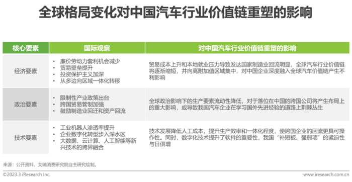 在新冠疫情导火索的影响下,全球价值链格局变革直接影响我国汽车行业的价值链重塑。在【经济层面】,全球劳动力套利机会下降和多边贸易成本上升,导致跨国企业价值链向母国回流趋势显著。在【政治层面】,部分经济体的全球化政治基础在疫情间逐渐动摇,开放性的产业政策出现了显著的紧缩效应,导致汽车行业核心生产要素在我国流动性降低。在【技术层面】,数字化技术提升生产效率,降低人工依赖;同时智能化、新能源的发展将核心价值集中在少数知识密集型部件上。
