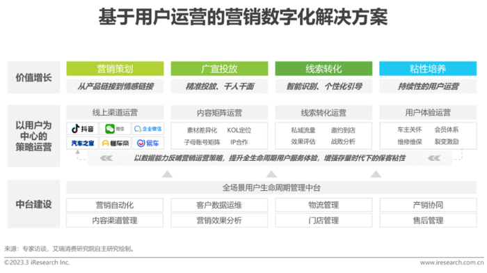 艾瑞数智汽车行业能力主要围绕客户购车用车全旅程,从能力内环向运营外环延申,从营销到售后,从公域到私域,从数据洞察到研究咨询,为客户提供全链路综合解决方案。