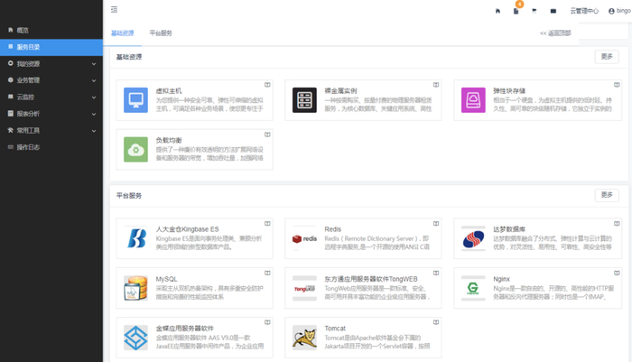 在统一服务目录下,用户可以像选购商品一样选购服务目录中的各类资源和服务,如常用的各种不同“硬件”配置的云主机(CPU、存储和网络),以及相应的操作系统、中间件、数据库环境等等,结合平台的多租户管理模式和自定义的审批管理流程,有效提升了云上业务应用实现的合规性和敏捷度。