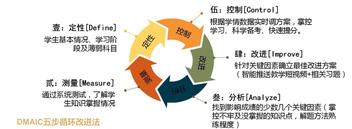 据创而新(广东)数媒运营总裁孙自伟介绍,海棠树学情导航应用的基本模型参考了著名的6σ质量理论的五步循环改进法( DMAIC ),通过五个步骤持续改进学生学习方法,提高学生学习效率。