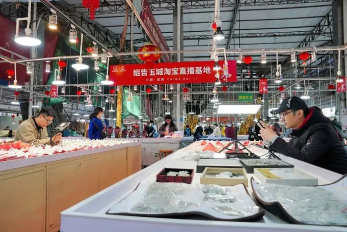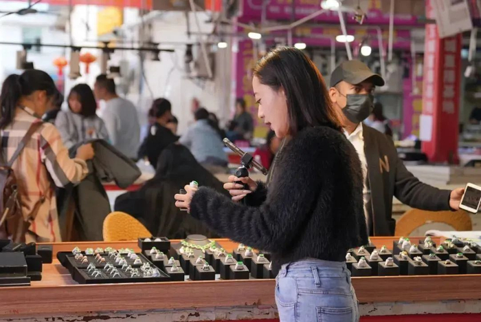 而帮助思思挖掘出这一优势的,正是点淘。2018年,淘宝直播驻扎进云南瑞丽,淘宝、瑞丽珠宝玉石协会与姐告玉城签订合作协议,共同成立“姐告玉城淘宝直播基地”。自此,瑞丽珠宝正式开始销售转型,迎来了“直播时代”。
