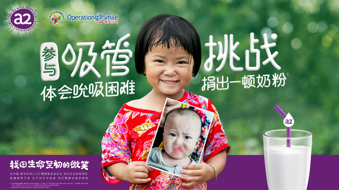 为了帮助这些特殊的孩子们找回灿烂微笑,今年,a2牛奶公司在“找回生命至初的微笑” 公益活动的第二季,发起这项“吸管挑战”,让大家亲身体会唇腭裂宝宝进食不易,呼吁更多人关注,用公益行动为需要帮助的儿童带去微笑和希望。