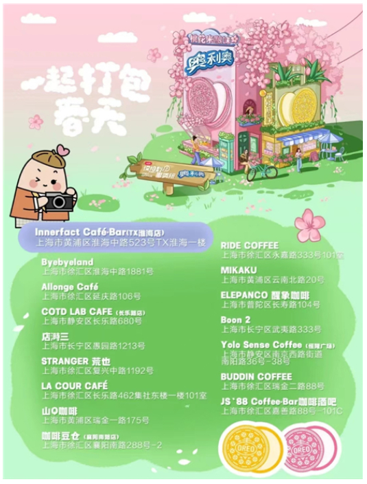 在消费者的丰富定义下,#一起打包春天#的灵感创意吸引不少用户。为将这份创意继续延续,小红书“没想到事务所”联合奥利奥与上海31家热门咖啡店合作,推出“奥利奥春日特调”饮品。