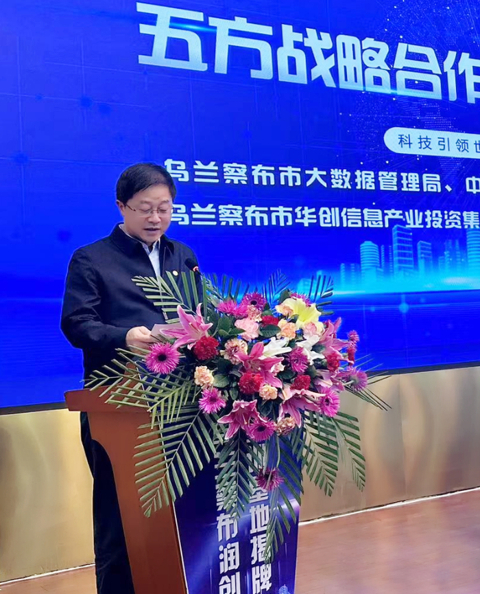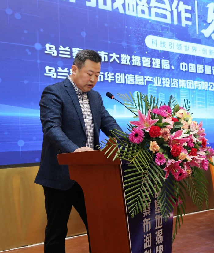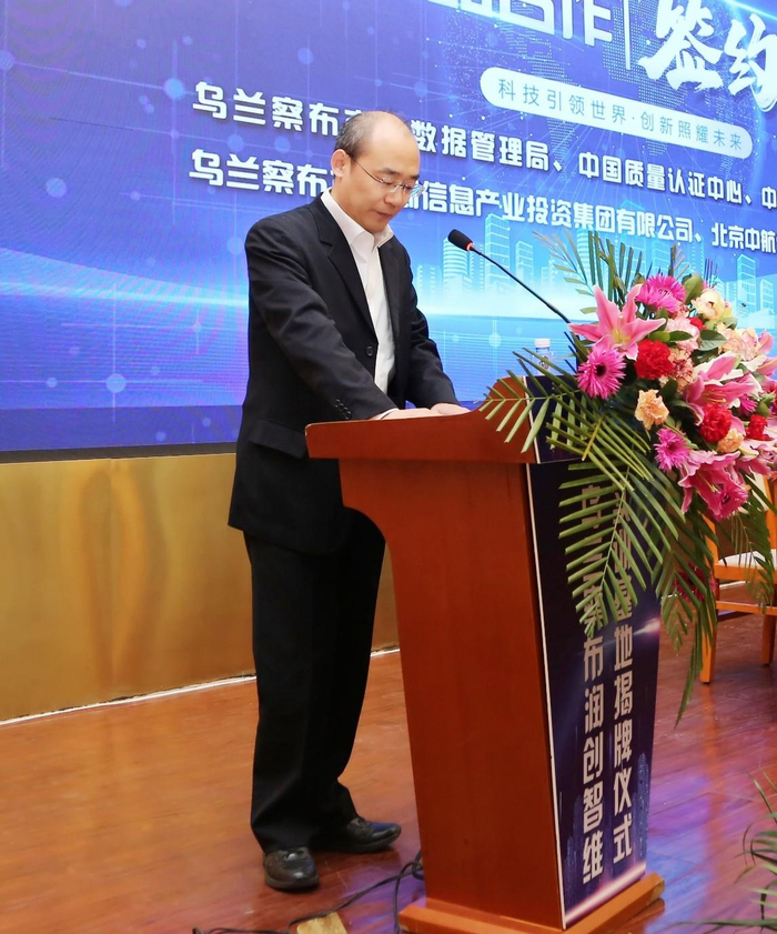 乌兰察布市网信办(大数据局)副主任(副局长)刘焕所先生、中国质量认证中心副主任刘江先生、中国计量科学研究院先进测量工程中心主任武彤先生、乌兰察布市华创信息产业投资集团有限公司董事长张向东先生和北京中航信柏润科技有限公司总经理冷飚先生代表合作各方致辞并共同见证了五方战略合作协议的签署。