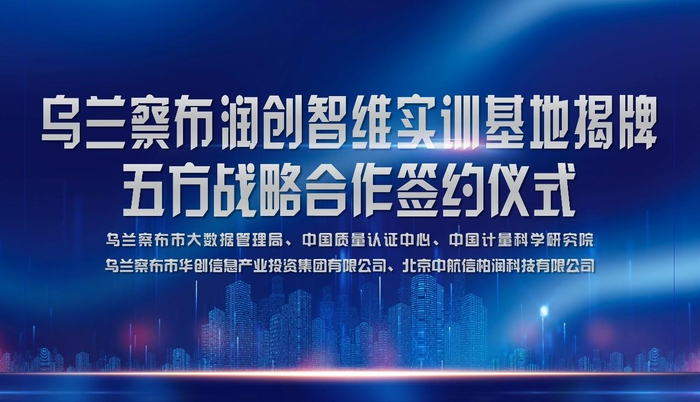 乌兰察布市大数据局数字经济发展科科长冯渊浩先生、中国质量认证中心产品一部经理郑涓女士、中国计量科学研究院智能工程实验室主任沈庆飞先生、乌兰察布市华创信息产业投资集团有限公司副总经理常桐瑾和北京中航信柏润科技有限公司副总经理徐骏代表合作各方签署了战略合作协议。