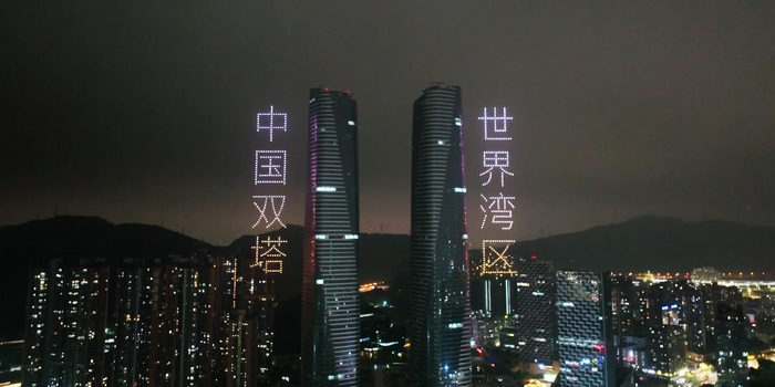 600架无人机腾空而起,先以双色线8字型绕塔飞行,后渐渐组成文字“世界湾区·中国双塔”,文字与73层双子塔同高,如同双子塔落下的两幅巨型条幅。
