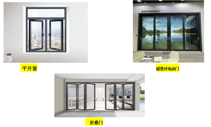 产品主要有平开窗,平开门,折叠门,磁悬浮自动门。主材采用国内一线品牌:兴发铝材,信义玻璃原片,坚朗五金,白云胶,凯森贝格折叠五金。表面处理采用的是10年抗老化氟碳喷涂工艺。
