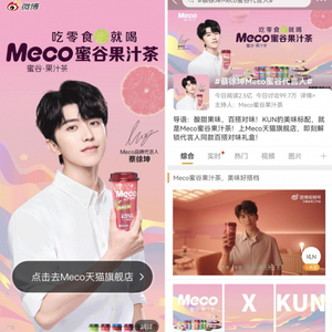 4月11日,Meco蜜谷果汁茶官宣全新品牌代言人蔡徐坤,瞬时引爆,刷屏不断!#蔡徐坤Meco蜜谷代言人#火速冲上微博热搜话题榜单。官宣日当天全网曝光总量高达19亿,互动量500万,热度非凡。可以说,Meco蜜谷果汁茶此次官宣,不仅深度触网Z世代消费群体,也透露着其跻身行业一线品牌的决心。