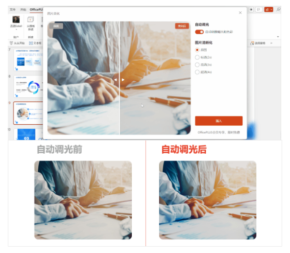 目前插件里的 AI 功能支持图片清晰化,一键换肤等都在【AI实验室】的功能里,看来微软官方希望通过 OfficePLUS 作为国内版的 AI 功能头阵没错了,应该后面接着会有大招功能出现。