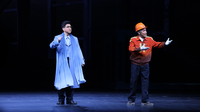 朱绍玉老师介绍,全剧的唱腔基本上都是原汁原味的京剧唱腔,唱腔和音乐都是在管弦乐团的配合下完成的,风格统一,主调鲜明。通过具体音乐的表达,突出人物心境、烘托气氛。当创新团队面对生活中的困难时运用了三重唱的写作手法来体现每个人内心的复杂心理活动;在遇见重大决策以及展现中国工人力量的情节时,则运用了恢宏的大管弦,大合唱。