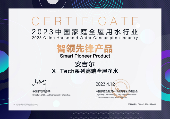 无论是超前沿的航天科技与净水产品结合,还是联合超跑设计团队设计的亮眼科技外观,以及IoT智能化体验,安吉尔X-Tech全屋净水给用户的用水体验带来跨越式的升级。在2023年中国全屋用水行业高峰论坛上,安吉尔X-Tech系列高端全屋净水产品斩获了2023中国家庭全屋用水行业智领先锋产品奖,持续引领行业技术创新。