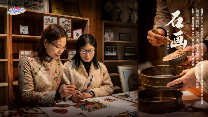 嘉宾们的寻宝之旅当然也不止于此,他们来到了远离城镇的东漓古村,在前所未有的宁静氛围中,开启了下一阶段的新委托。油茶、团扇、石画、傩舞等非遗技艺以委托的形式出现在了嘉宾体验环节中,这些非遗技艺的传承人们摇身一变,成为了发布委托的“NPC”。