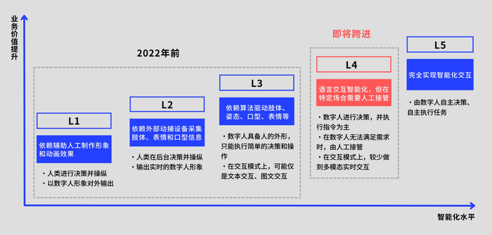 IDC将数字人的发展定义为5个阶段,并认为2022年之前数字人大多处于L1-L3的阶段,在内容生成技术的浪潮下,数字人即将跨进L4阶段,实现初步的智能化交互。进一步提升员工生产力、创造力,优化用户体验,释放社会价值和商业价值。