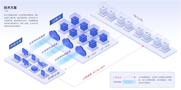 翼信蓝鲸基于云网融合的新一代云宽带的网络底座,借助边缘云计算优势,通过对象存储、文件的切片化多线程传输、映射挂载式的访问,实现数据的极速存储与超快捷访问;满足了家庭、企业等不同场景的高性能存储需求。