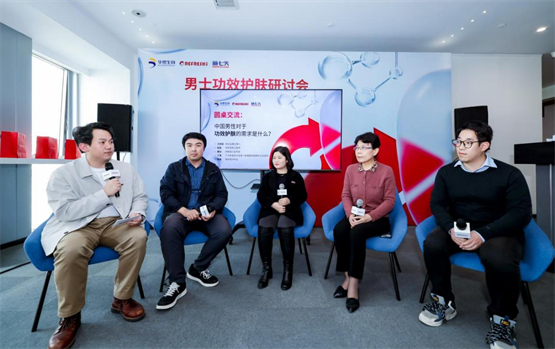 男士功效护肤研讨会专家论坛嘉宾从左至右依次为珂岸品牌主理人王瑞斌、华熙生物资深原料工程师陆震、护肤品行业专家墨白、中医药大学第一附属医院皮肤科主任医师丁慧、知乎成分kol俞晓博士