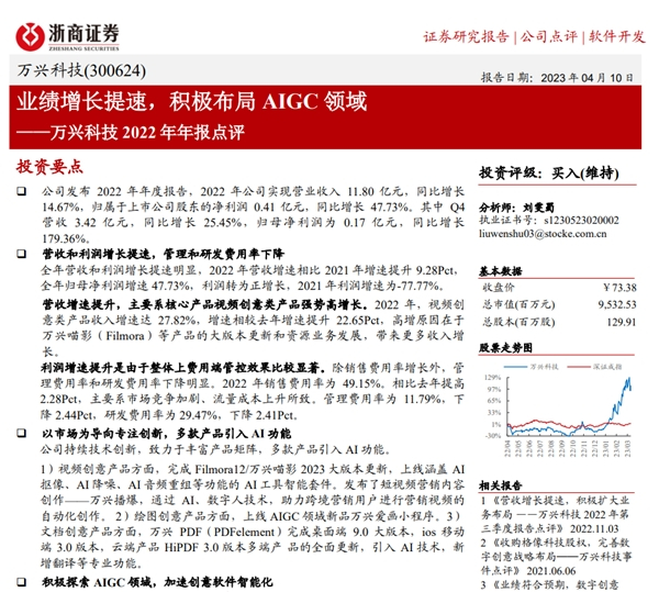 浙商证券研报分析,万兴科技2022年全年营收和利润增长提速明显,主要系核心产品视频创意类产品强势高增长,万兴喵影(Wondershare Filmora)等产品的大版本更新和资源业务发展,带来更多收入增长。