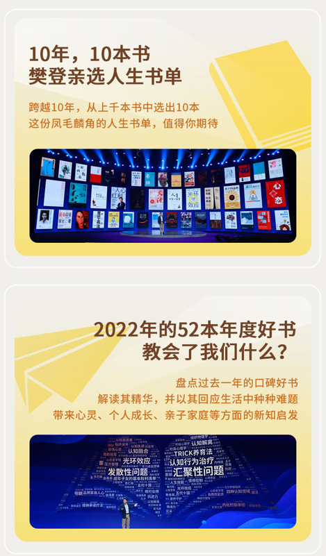 今年的“知识进化论”主题演讲于4月23日准时回归! 在这里,你将不仅收获樊登亲自挑选的十年人生书单,樊登更将通过四个篇章,回顾2022年的五十余本好书,解读其精华,针对生活学习中遇到的痛点进行回应,给大家带来心灵、成长、认知方面的新知启发。