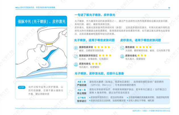 按照上述分类原则,针对常见项目,绽妍联合多位皮肤科专家进行详细的术后科学修护科普。以强脉冲光(光子嫩肤)为例,《指南》从是什么、适用场景、术前准备、术后注意事项以及急性期、恢复期、稳定期的修护进行介绍。通过图表的形式,直观提供修护原则和修护方案。