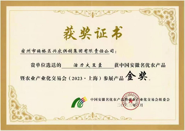 此次“埇上兴农”作为埇桥农产品认证型品牌亮相大会,也是品牌迈入新征程的起点。在交易会上,嘉宾对烧鸡、豆制品等系列产品进行现场品鉴,受到一致好评。在本届大会1000多家展销主体、4000余种展品激烈角逐中,“埇上兴农”系列大豆羹产品斩获交易会参展产品金奖。