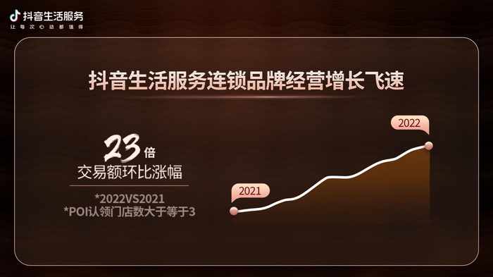 作为餐饮经营新阵地,抖音生活服务不断为广大餐饮商家带来生意增量。如今,抖音生活服务业务覆盖全国370+个城市,合作门店超200万家。其中,抖音生活服务POI认领门店数大于等于3的连锁品牌,2022对比2021年整体交易额环比增长了23倍。这说明,越来越多的连锁品牌在抖音生活服务的投入产出不断扩大,打开了长效经营新路径。