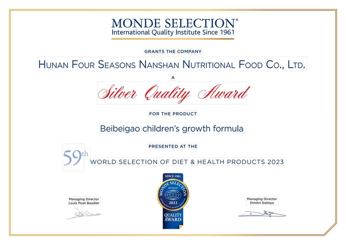 近日,由世界品质品鉴机构Monde Selection主办的“世界食品品质评鉴大会”奖项揭晓,继2021年、2022年之后,四季南山倍贝高儿童成长奶粉再次揽获大奖,向世界证明了自己的实力!