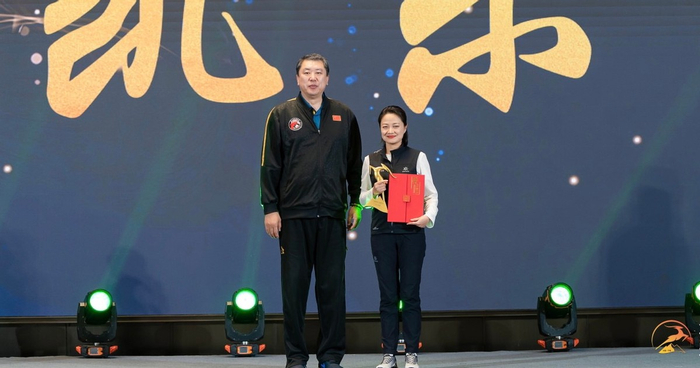 浙江省宁波市体育局党组书记、局长、体育总会主席张霓为“金羚羊”传播奖获奖纪录片《雅荻跑世界》颁奖