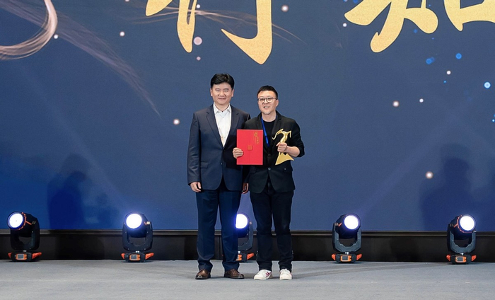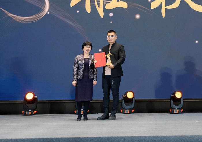 华奥星空科技发展有限公司总裁秦吉宏为“金羚羊”策划奖获奖单位行知探索文化发展集团颁奖