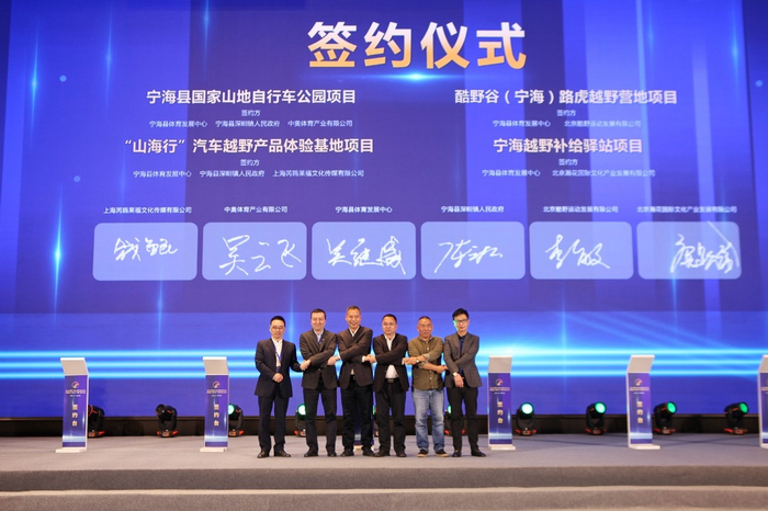 大会还进行了宁海县国家山地自行车公园项目、酷野谷(宁海)路虎越野营地项目、“山海行”汽车越野产品体验基地项目与宁海越野补给驿站项目的签约。宁海县体育发展中心主任吴继盛,宁海县深甽镇人民政府镇长陈云松,中体赛事集团、中奥体育有限公司总裁助理吴云飞,北京酷野运动发展有限公司董事长李敏,上海芮欧莱福文化有限公司COO钱鲲,北京瀚花国际文化产业发展有限公司投资顾问朱林出席签约仪式。