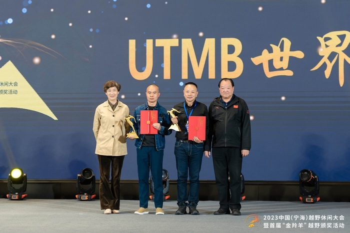 中国社会体育指导员协会会长邱汝、中国奥运首金获得者许海峰为“金羚羊”国际交流奖获得者金飞豹、费宣及UTMB系列赛颁奖