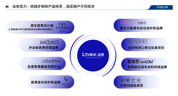 据了解,远想生物围绕再生医学理念,打造特色品牌与产品矩阵,构建8大自有品牌,产品覆盖医疗美容机构、生活美容、连锁零售集合店、线上零售等渠道,解决求美者在面容、私密、身体、头皮等领域的多种需求。