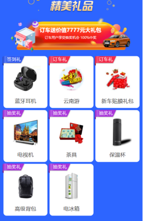 订车抽奖礼:订车的用户还可以再次参与抽奖活动,奖品有电视、电冰箱、高级背包、保温杯、茶具等等,抽奖100%中奖,惊喜连连。
