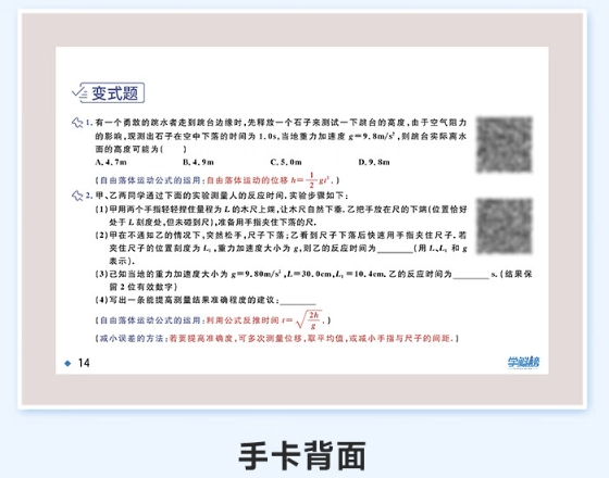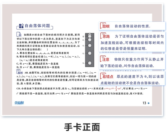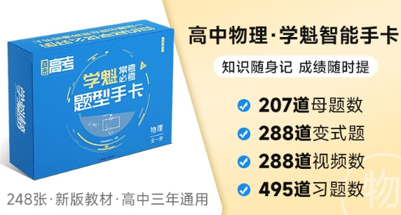 为方便学生学习,学魁榜智能教辅《学魁题型手卡》附带记忆环和错题环,所有卡片可以自由拆卸组合,想攻克什么知识点只需把对应的卡片挑出来单独组合成册即可随身携带轻松学习。无论在家还是在学校,在公交、地铁、餐厅......只需一张卡片,这些碎片化的时间都可以随时随地学起来。而且《学魁题型手卡》上的所有试题均附有视频解析,一题一码,遇到不懂地方,扫码即可观看听清北学霸真人讲解,还可以一键加入错题集,方便下次复习巩固。