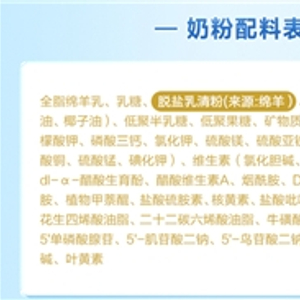 佳贝艾特悦白6项常规强化配方均有添加,特色强化配方添加了左旋肉碱、OPO结构脂。从配料表上看,佳贝艾特悦白含有棕榈仁油、葡萄糖浆固体,算是美中不足的地方。