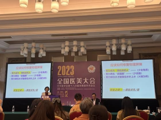 来自南京医科大学附属医院(江苏省人民医院)皮肤科的骆丹教授在本次大会上就以“医美过程中的皮肤屏障受损及修复”为主要内容进行了演讲,指出了再生皮脂膜和锁水的重要性。同时提到毕生之研屏障修护乳液中的核心成分苔丝适应原及两大自研成分PL-Ceramide™和PL-PhytoSLC™,都能够帮助重构受损屏障,强化肌肤自我修护能力,减少敏感及泛红,打造「厚脸皮」。