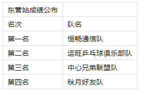 此次比赛为混合团体赛,分为男子单打、男子双打或混合双打、第二男子单打三个项目。 经过激烈角逐,恒畅通信队、运旺乒乓球俱乐部队、中心兄弟联盟队、秋月好友队获得东营分站赛前四名。