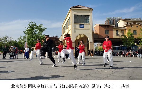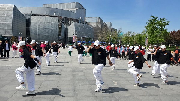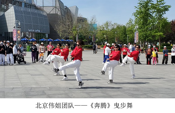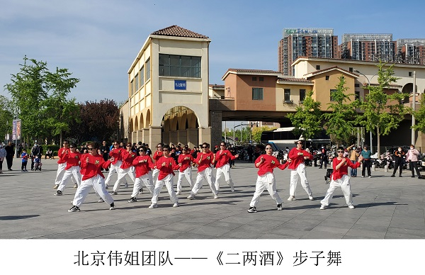 来自海淀区昆玉河畔的北京伟姐团队的《二两酒》和《串烧》步子舞,队员们鲜艳的红色衣服与整齐欢快的舞步引人注目,开场就引来阵阵喝彩与掌声。