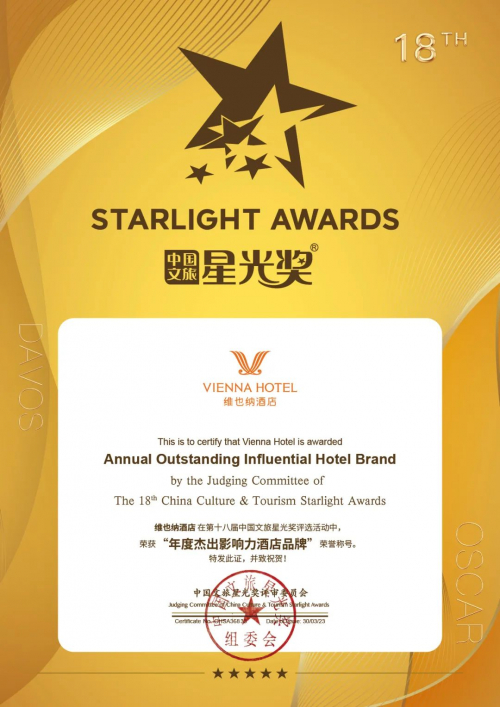 中国文旅星光奖通过成立奖项评选组织委员会,以大众推选、行业推荐、企业自荐、媒体测评及专家评审等方式,紧贴行业发展,对年度文旅及酒店发展的辉煌业绩做出年度总结;嘉奖业界卓越领袖,表彰为推动业界竞争发展、做出重大贡献的行业企业。感知文旅酒店业发展的真实温度,见证文旅酒店业的前进步伐,被誉为“中国文旅奥斯卡”。维也纳酒店连续4次蝉联“年度杰出影响力酒店品牌”奖项,可见其含金量有多高,全面诠释了酒店行业与消费者对维也纳酒店品牌的充分认可与期待。
